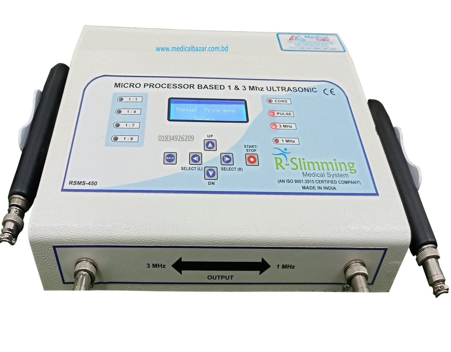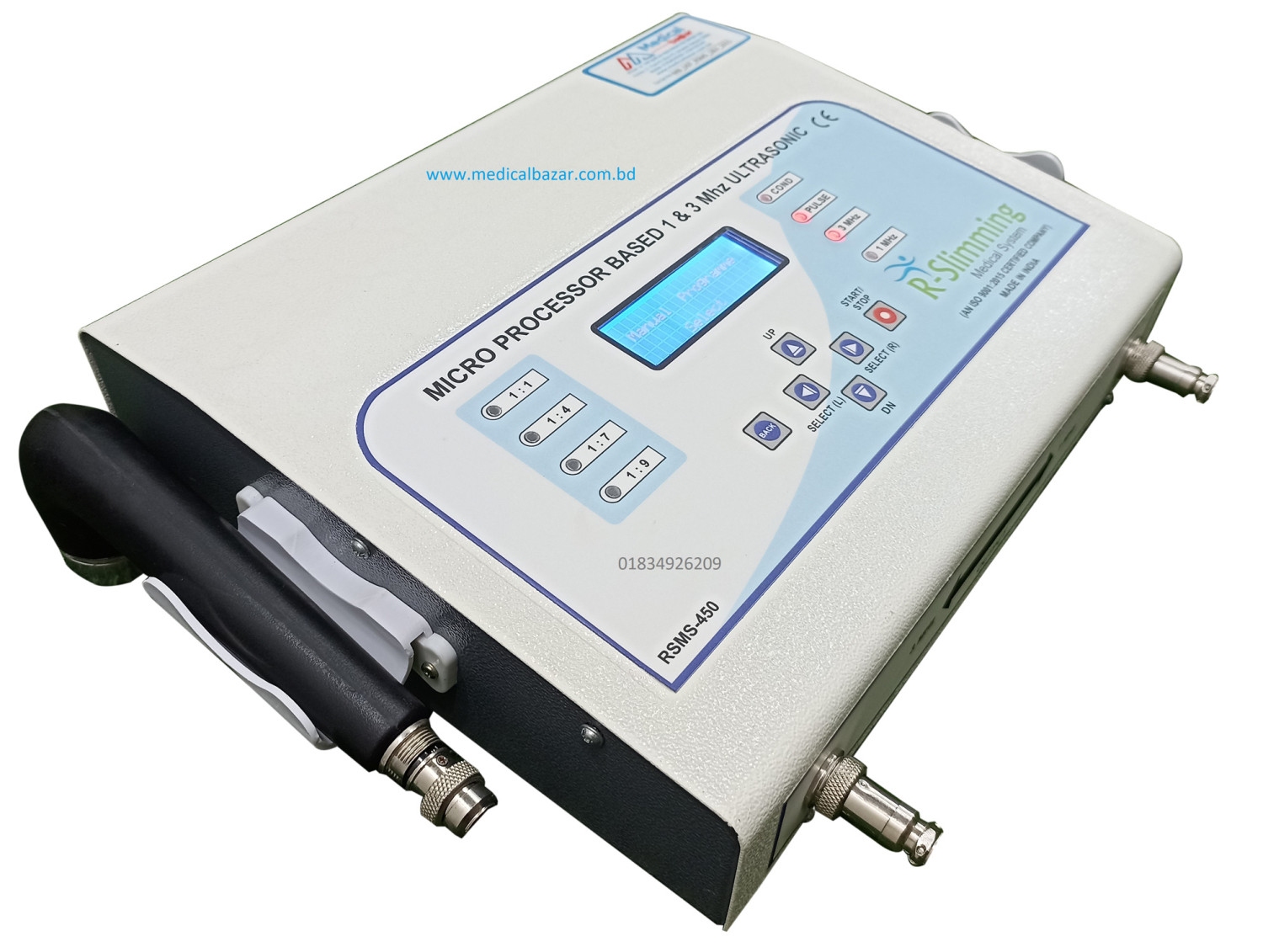RSMS-450 is advanced microcontroller based dual frequency ultrasound therapy equipment. It combines the functions of both 1 MHz & 3 MHz. Zoomed backlight LCD panel and a soft touch membrane keyboard enables the physician to set the parameters easily.